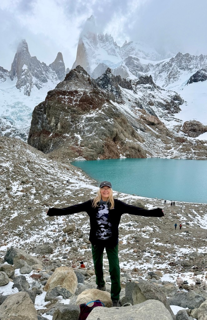 We hiked the Laguna de los Tres, it was an 18.8 miles round trip from our stay in El Chaltén. It took us about 9 hours of hiking and then we decided to hang out on top of the trail for several hours, including lots of stops for photos (because… how could you not?). When you are in your early 60s and trained for a demanding hike, it still pushed me more than anticipated. There were lots of boulders the last km which was all uphill.