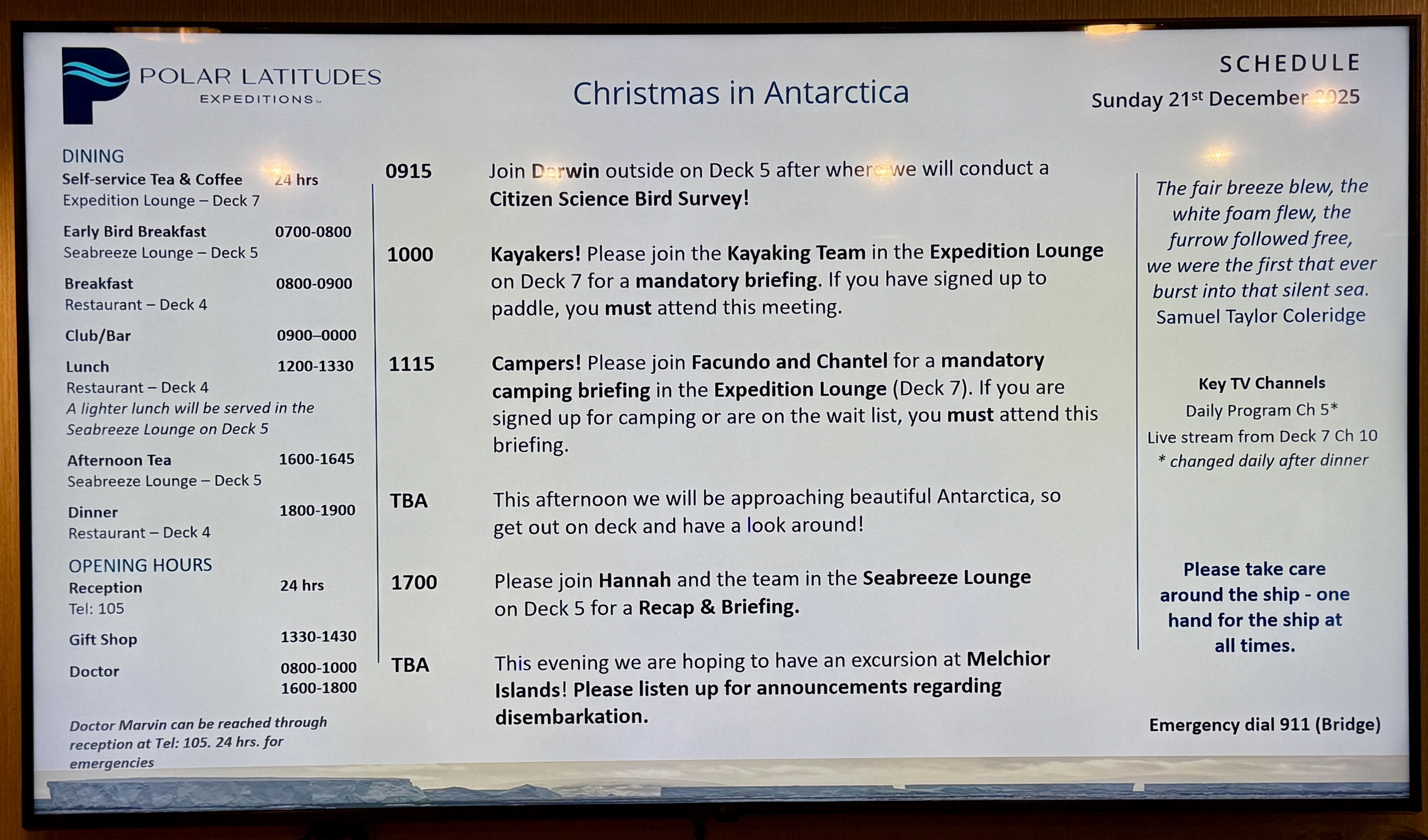 The schedule was always posted the night before, but mornings came with real-time updates — because in Antarctica, plans are suggestions, not promises.