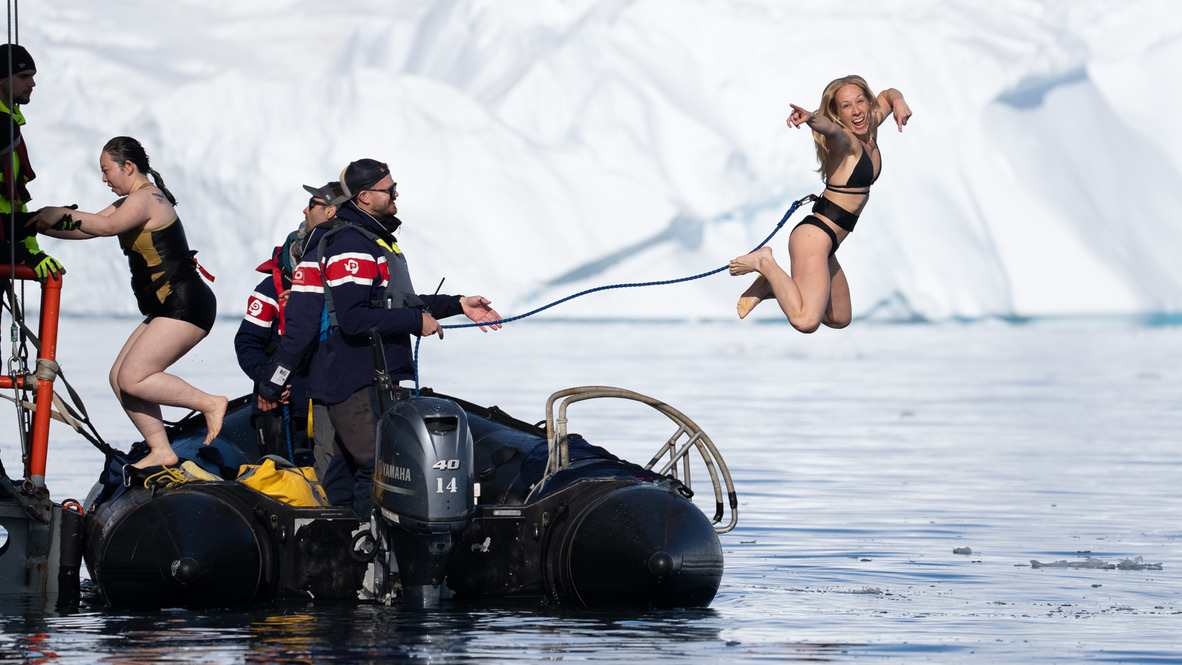 Some passengers did the polar plunge (over half the ship). I did not. My daughter was one of the brave polar plungers—you can see her jumping in below. Jumping into –1°C water held no appeal — and that choice was completely respected.